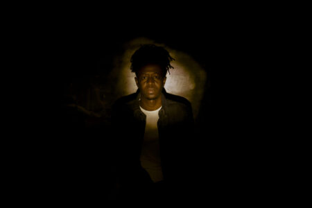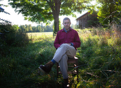 Porträtt av John Stauffer som tittar in i kameran, framför ett tunt draperi och med foton i bakgrunden.