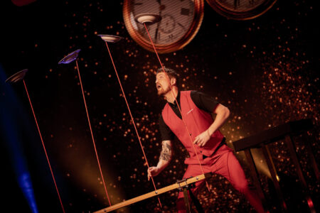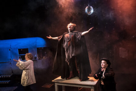 En kvinna och en man i festkläder, partyhattar och obekväma ansiktsuttryck står på varsin sida av ett vitt bord på en teaterscen.