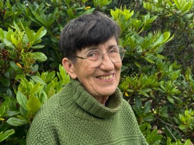 Rosaklädd kvinna med brunt hår och glasögon står framför ett träd med fårad bark.