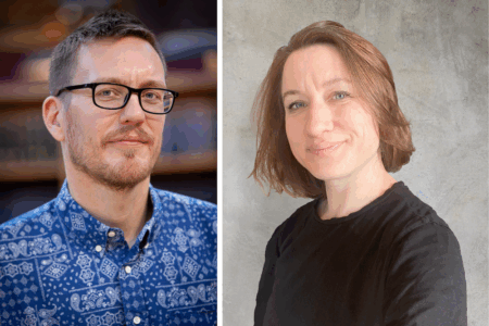 Två porträtt och framsidan på en bok.
