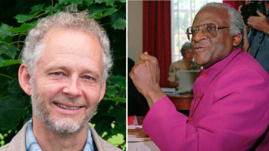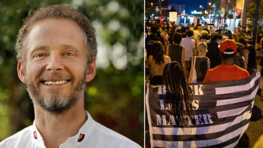 Nikolas Berg till vänster. Till höger två händer, en svart och en vit, som håller om varandra.