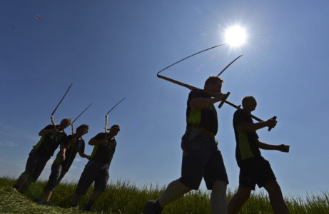 Sex personer i silhuett mot en solnedgång, några gör segertecken med händerna.