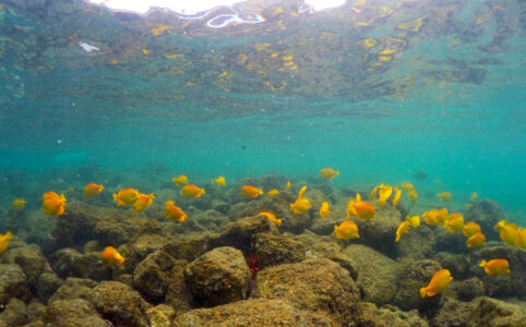 Havssköldpadda simmar längs korallrev. FN-länder enas om ett havsavtal som ska skydda sådana miljöer.